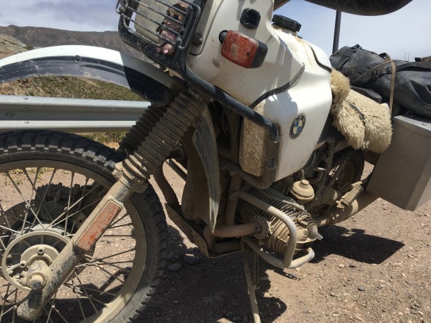 … also wieder ab nach Argentinien, es regnet und hat nur 6-8 Grad… aber wir müssen weiter… immer entlang am Lago General Carrera, einem der größeren Seen Südamerikas…die Fahrt ist durchgehend auf Schotter und Schlamm bzw. feiner Sandstrasse, gut zu fahren, aber dementsprechend schauen wir und die Mopeds am Nachmittag aus… Der Dreck am Moped wird hart wie Zement, also schauen, dass die Chromflächen der zB Stoßdämpfer oder Federbeine sauber gehalten werden (danke für den Tip Reiner!) …der Grenzübergang ist unproblemtisch und dauerte ca. 30 Minuten …