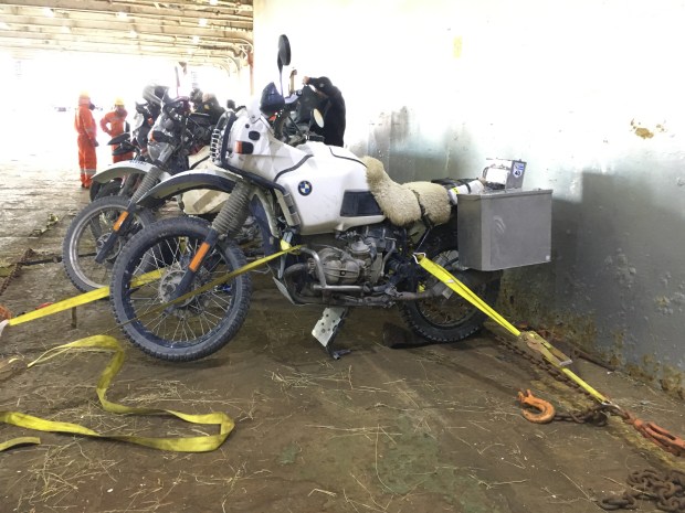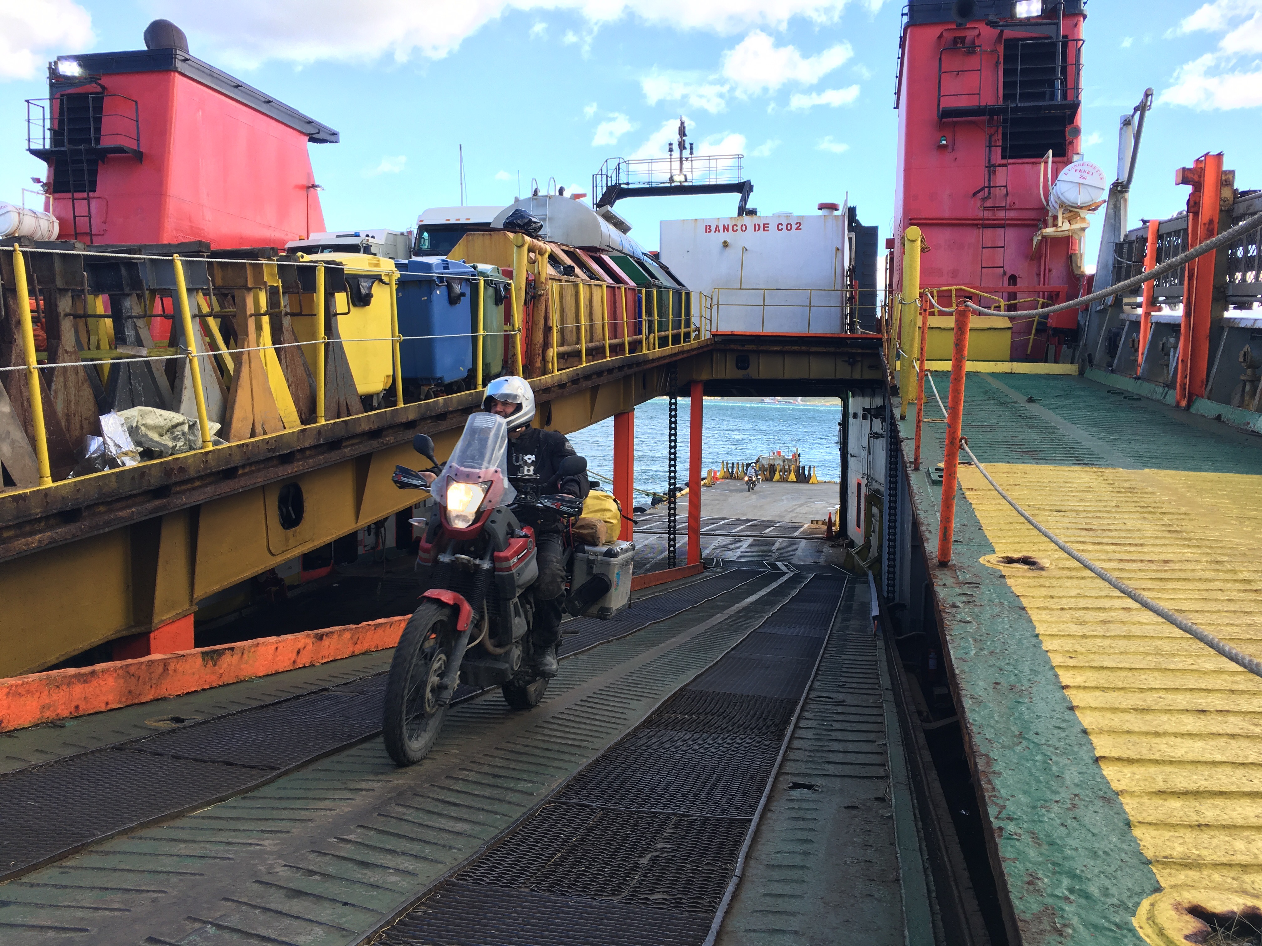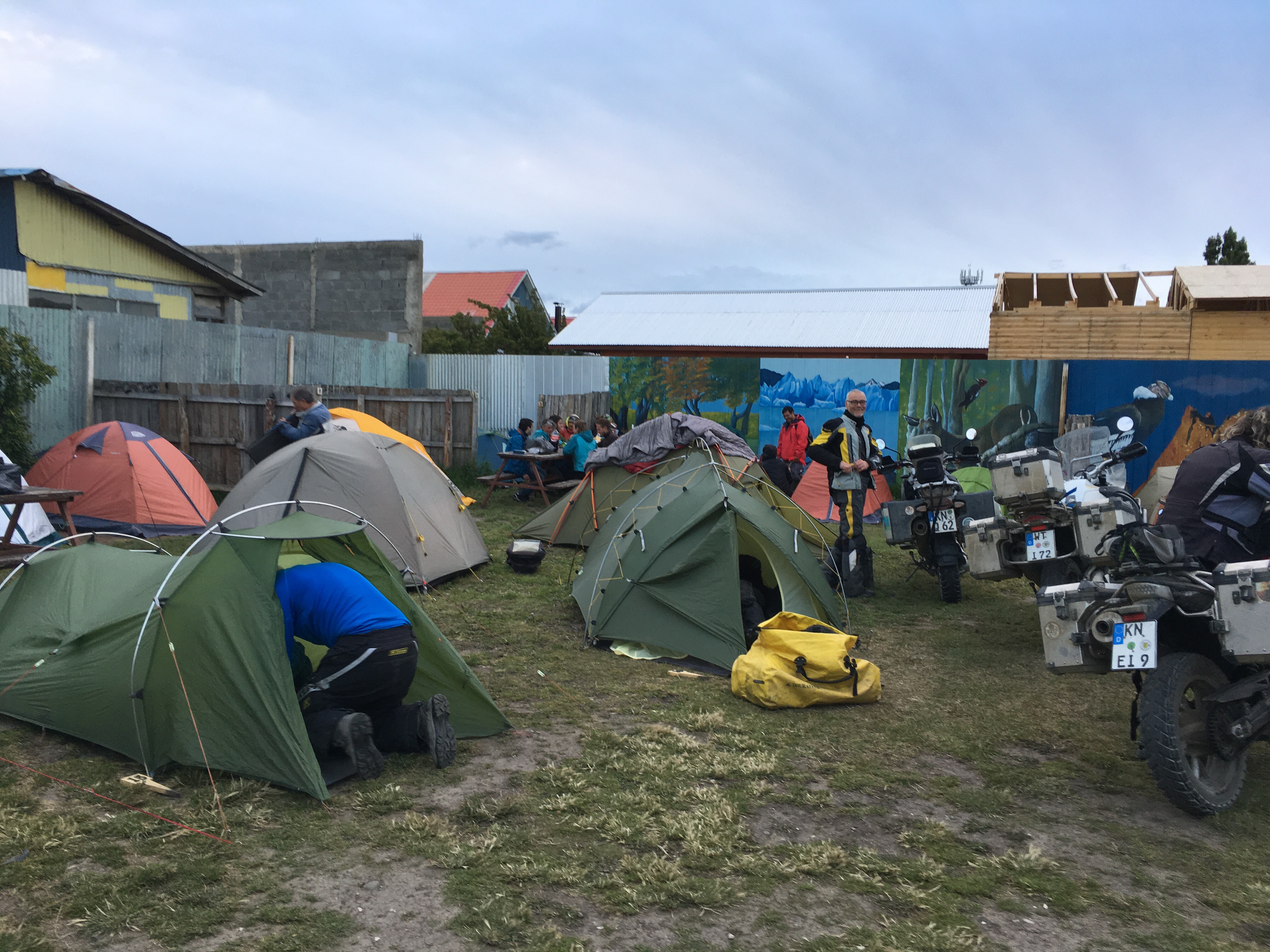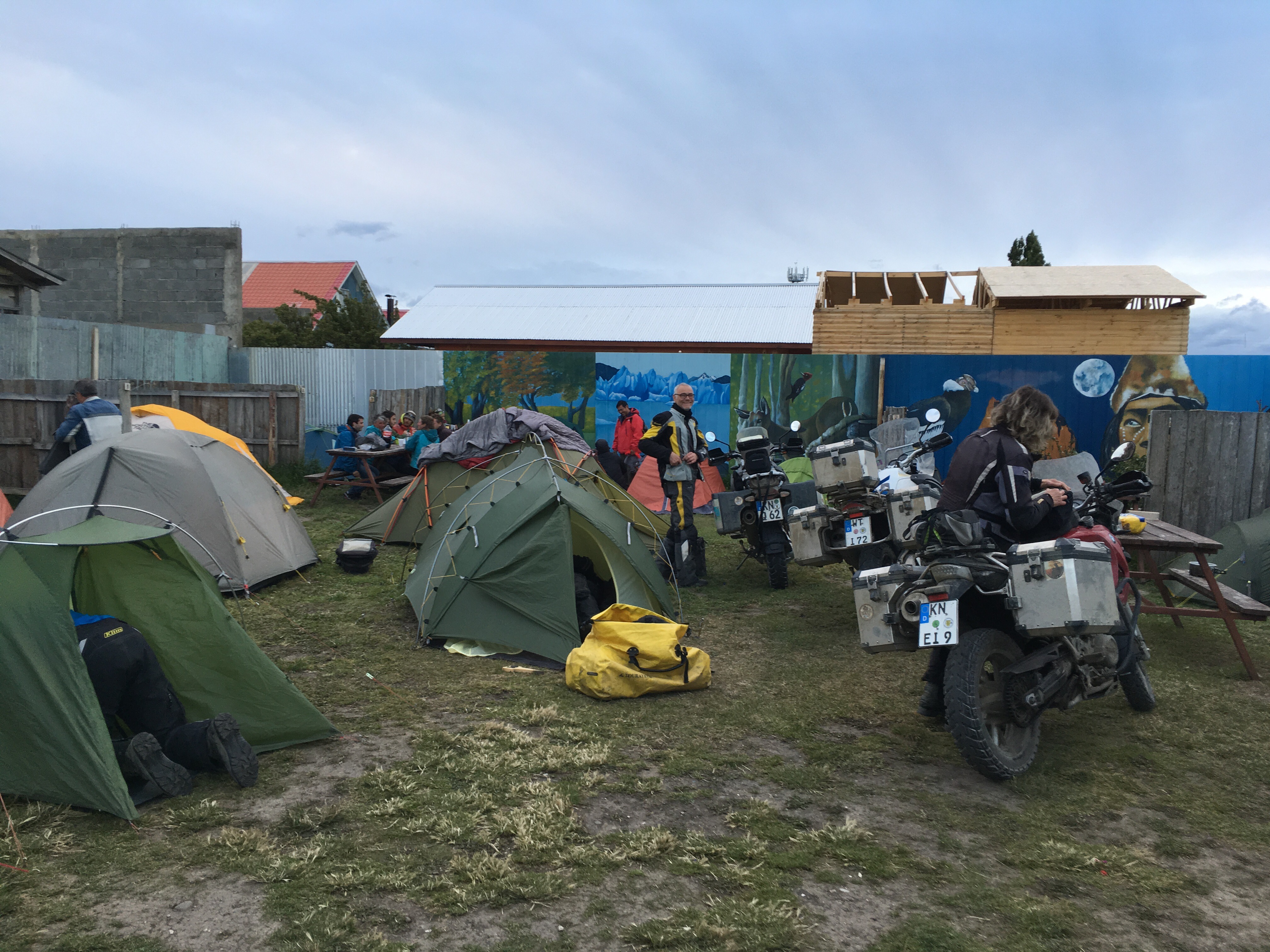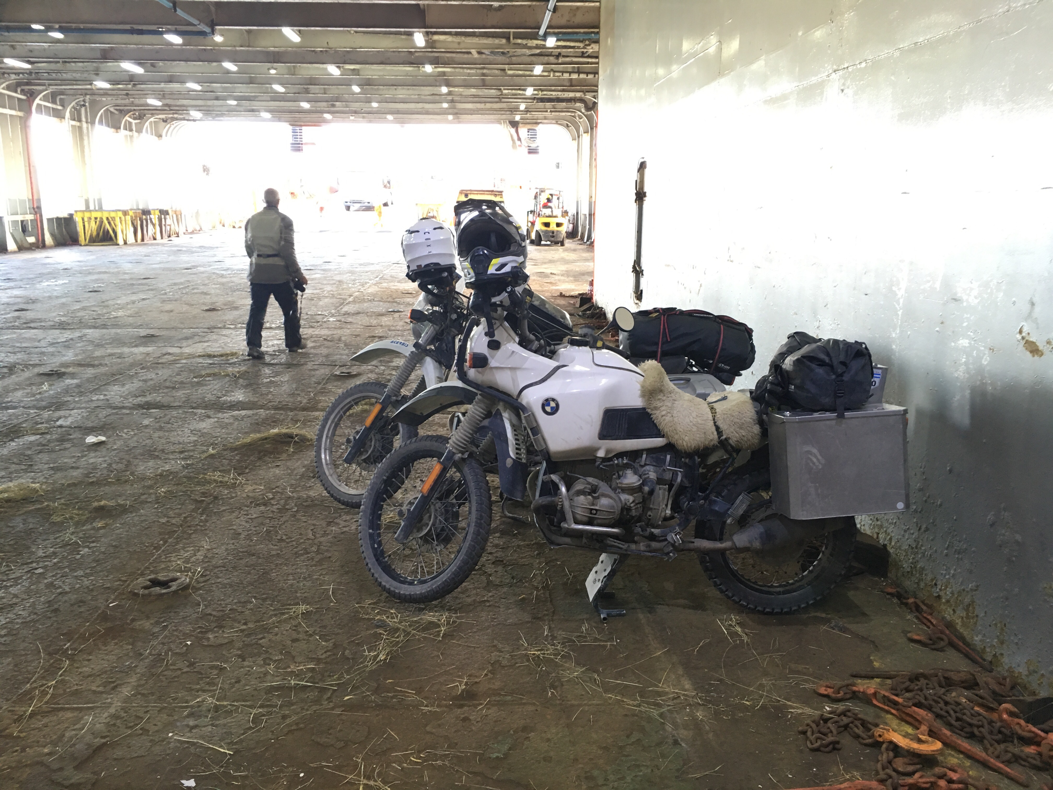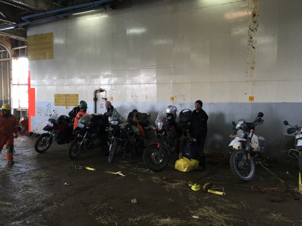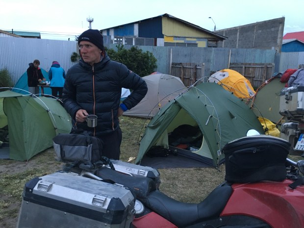 Die Fähre konnte wegen des starken Windes nicht vor drei Uhr Nachts anlegen. Somit mussten wir noch eine Nacht Campieren und gingen erst tagsdrauf um 10:00 an Bord. Abends zuvor trafen wir noch Leidensgenossen, vier Mopedfahrer aus der Bodenseeregion.